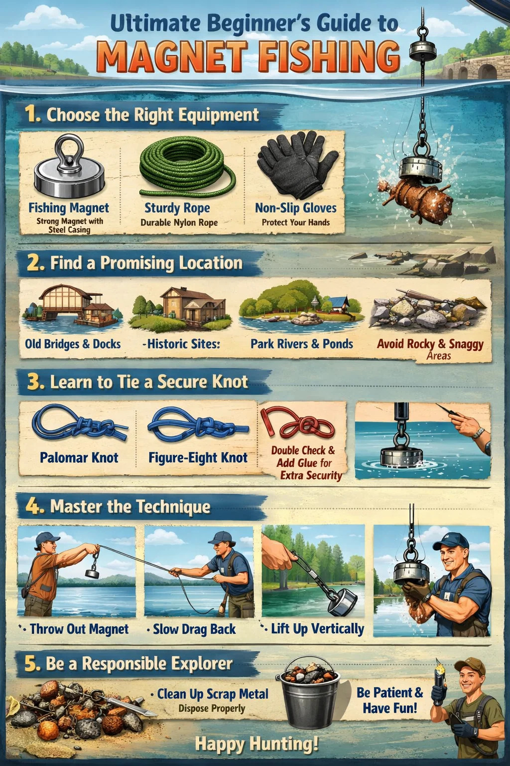 Temptans magnetem piscationem esse valde simplex; non indiget aliqua scientia physicae provectae vel eximiae virium. Quamdiu curiosus es de mundo summerso, facile incipias ab his gradibus: