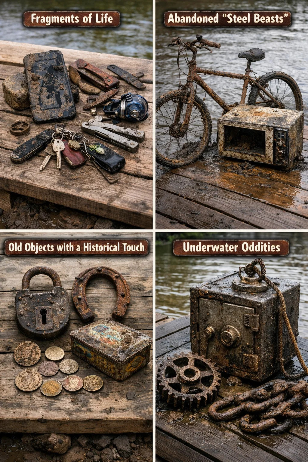 Partes industriales: anni ingentes, catenae ferrugineae, vel aliquae partes machinae officinae quarum nomina non amplius cognoscuntur. Tuta et pixides metallica: Tutam invenire saepe calees piscationis magneticae, et etiam si solum lutum et arenam continet, singularis effectus sensus cognoscendi ignota est.