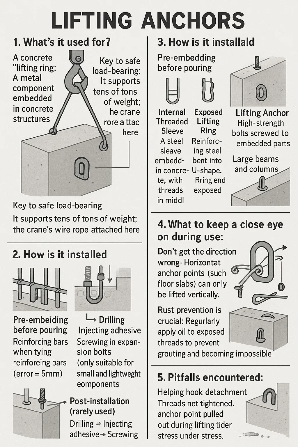 Concretum "anulum elevatum": elementum metallicum in concretis structuris (paucis parietibus, gradibus, radiis). Hami vel fulmina directe in illam ad levandum condonantur.