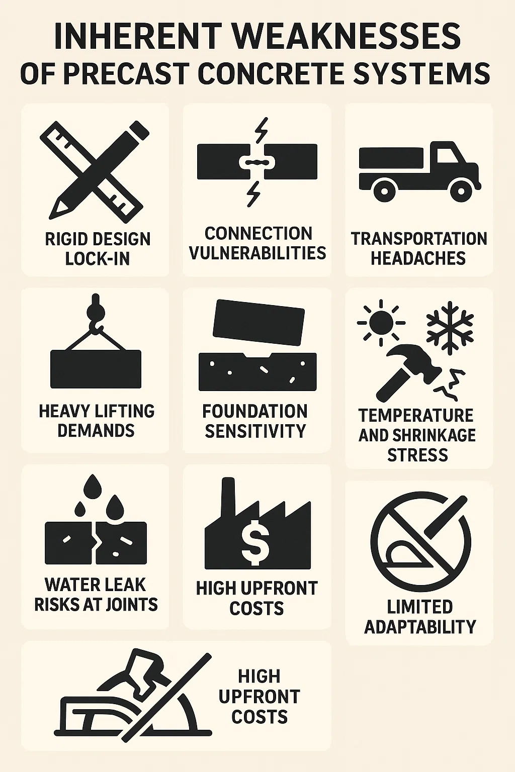 Articuli, ubi fulmen vel glutinum in unum compages sunt, debiles maculae sunt. Si coniunctiones non sunt perfectae, structurae rimas vel submovere possunt sub accentus, praesertim in motibus terrae vel ventis editis.