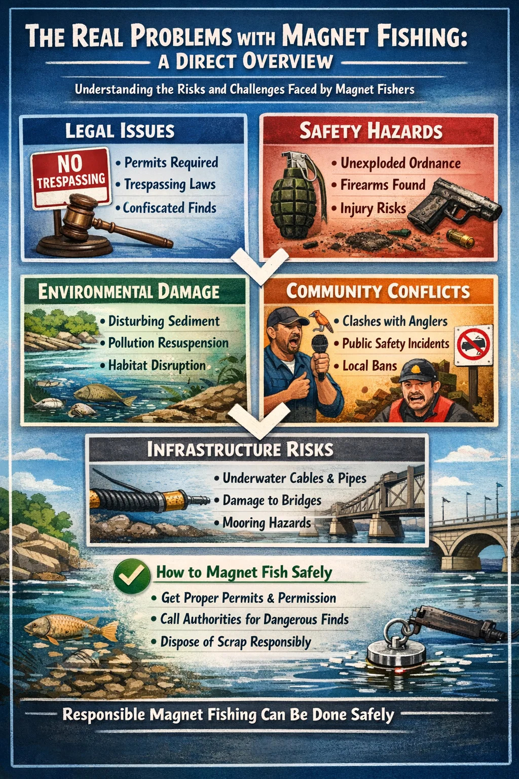Magnet piscatio veram problematum copiam habet - et graviores sunt quam plerique incipientium exspectant. Amat trahere potentem neodymium magnetem piscandi per flumina, canales, portus et lacus ut res metallicas ex aqua recuperare. In superficie spectat quasi actio velit innocens et in multis est. Sed problemata, quae cum eo veniunt, iuris expositio, periculum corporis, detrimentum environmental, pericula salutis publicae, conflictum communitatis constituunt. Nullae harum problematum hypotheticae sunt - omnes consecutae sunt in iniuriis, arrestationibus, finibus, interdictis publicis in multis regionibus.