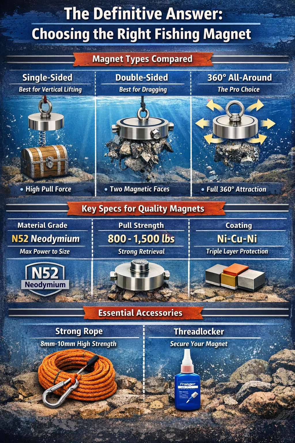 The 360-gradus late censetur optima electio gravis enthusiastarum quia magneticam viverra ab omni angulo praebet, casus capturae insigniter augens. Nam inceptos, a duplex postesque piscantur magnetis optimum statera inter sumptus, pondus et efficaciam praebet. Core materia semper debet Neodymium (NdFeB) speciatim N52 gradus, cum summae potentiae ratio amplitudinis in recentioribus technologia praebetur.