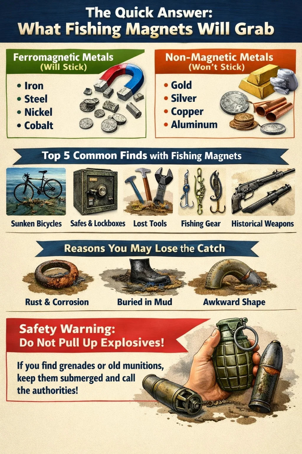dum piscantur magnetes sunt instrumenta inveniendi, periculum quoque invenire possunt. In multis partibus Europae et in nonnullis partibus US tormenta inexplorata (UXO) sicut grenades vel veteres testae mortarii evelli possunt. Haec items activa et periculosissima adhuc esse potest. Si vidisti aliquid quod explosivum similis, nolite tangere demergi, si fieri potest, retine, et statim bombam manipuli vocant